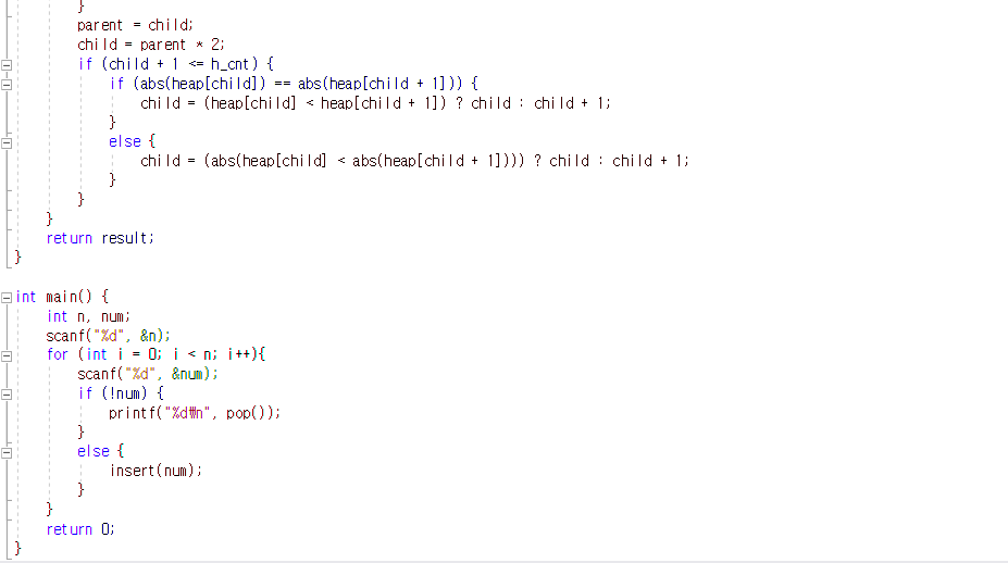 boj11286을 하는데 최소힙 베이스로 두고 절대값들을 비교하고 일반 값들을 비교하는 식으로 풀어보았다.